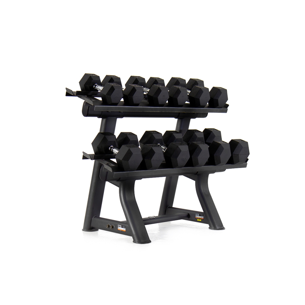Club Line Kauçuk Kaplı Dumbbell Seti (Çift), Konik Tutma Saplı, Çift Katlı (Yatay) Dumbbell Rack üzerinde (9 veya 10 çift kapasite) Kum Siyahı.